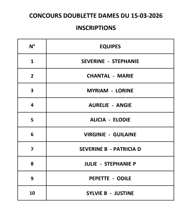 DOUBLETTE FORMEE DAMES DU 15-03-2026 DANS LE CADRE DU DROIT DE LA FEMME. Auteur/autrice de la publication :Bruno Pire Publication publiée :17 mars 2026 Post category:Club Encore une belle réussite pour notre concours doublette dames malgré une météo fraiche et un week-end d’élections. 10 équipes se sont affrontées dans une ambiance toujours conviviale. Equipe gagnante : Myriam / Lorine Vous devriez également aimer Éclairage des terrains 17 février 2018 Assemblée Générale 20 janvier 2019 7 janvier 2019 Stand du club de pétanque au Forum des associations 2015 26 novembre 2016